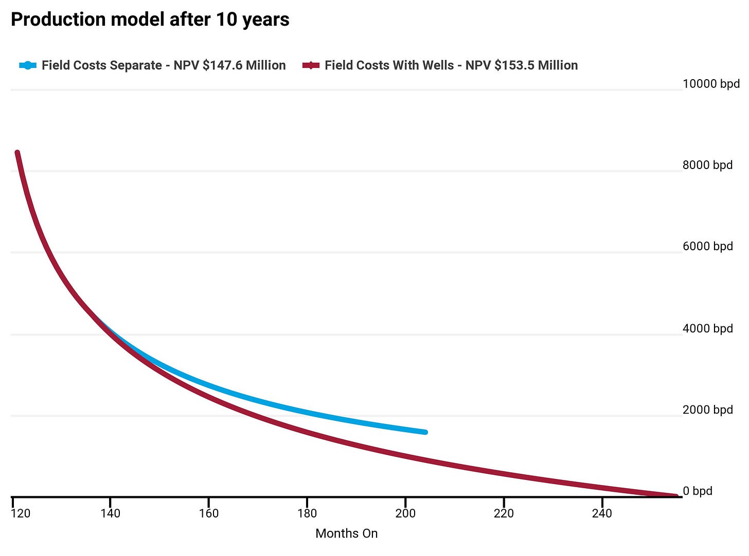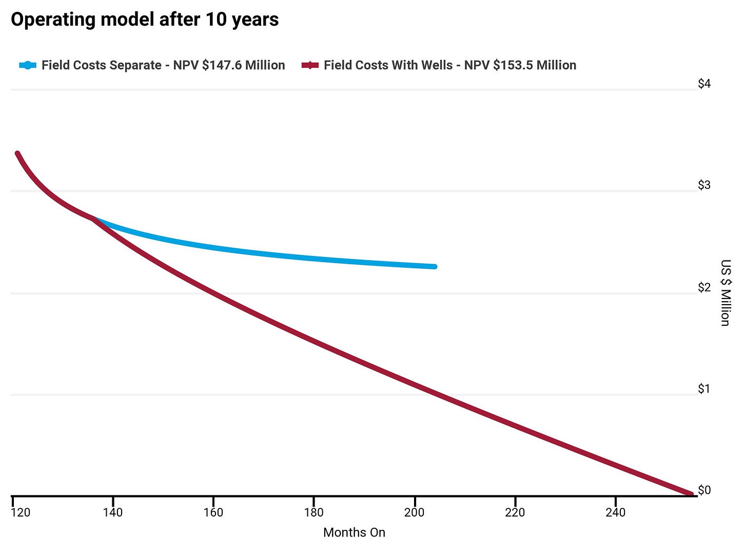 Of course, we can do things in the model to get the NPV closer in our case, or to represent actual field operations. For example, you’d have to assume a step-change in fixed field costs at some point once there are a lot fewer wells, so maybe you assume 25% savings on that fixed case once the well count drops below half. It’d need to be quantified, but there are ways.